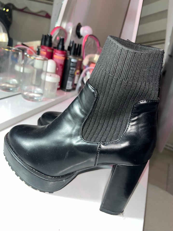 Madein China Marka Siyah platform topuklu kadın botu, rahat örme üst kısmı ve tokalı detaylarıyla trend günlük tarz için uygun. Kauçuk malzemeden, gotik stil. Hiçbir defosu yoktur kullanılmamıştır yurtdışından gelmiştir 37-38 numaradır
