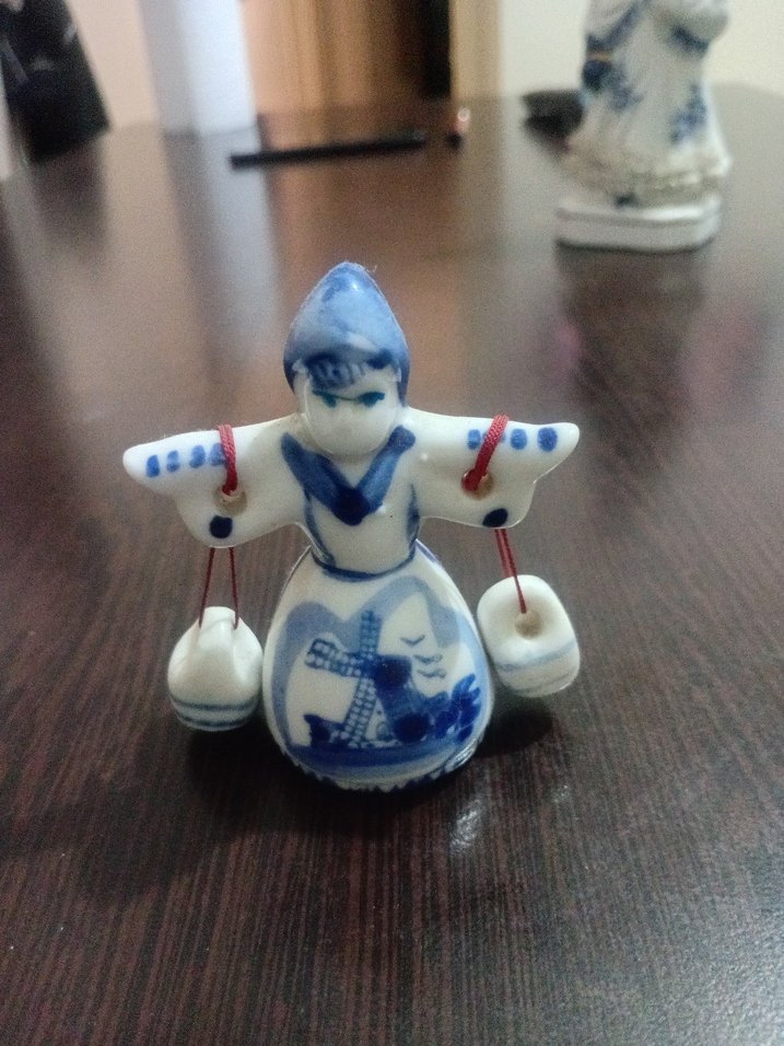 Süt taşıyan geleneksel Hollanda figürlü detaylı el boyaması ve yel değirmeni motifi ile mavi renkli porselen biblo,Kırık,atık yok 7.5 cm