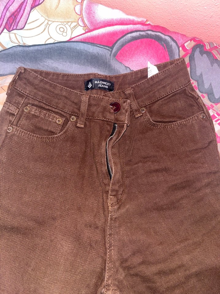 Düğmeli, kahverengi süet kumaştan, normal boy midi uzunlukta, dar kesim kadın pantolonu. Günlük sokak stili için uygundur.