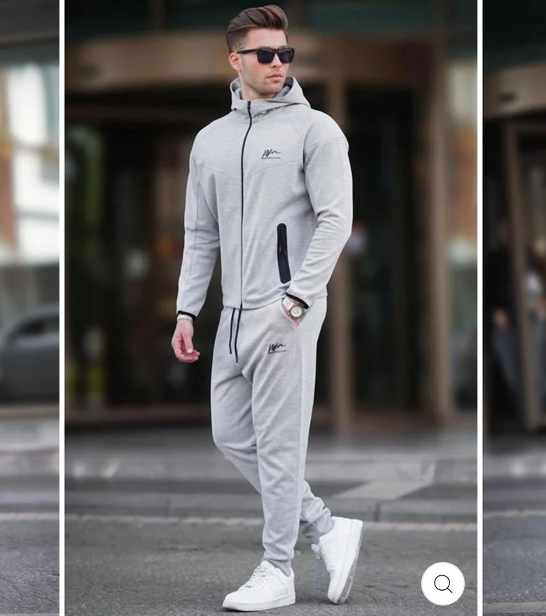 Gri renkli, normal kesim erkek eşofman takımı; uzun kollu, yuvarlak yakalı, fermuarlı cepler ve ön fermuar içerir. Yumuşak ve sıcak kumaştan yapılmıştır.
