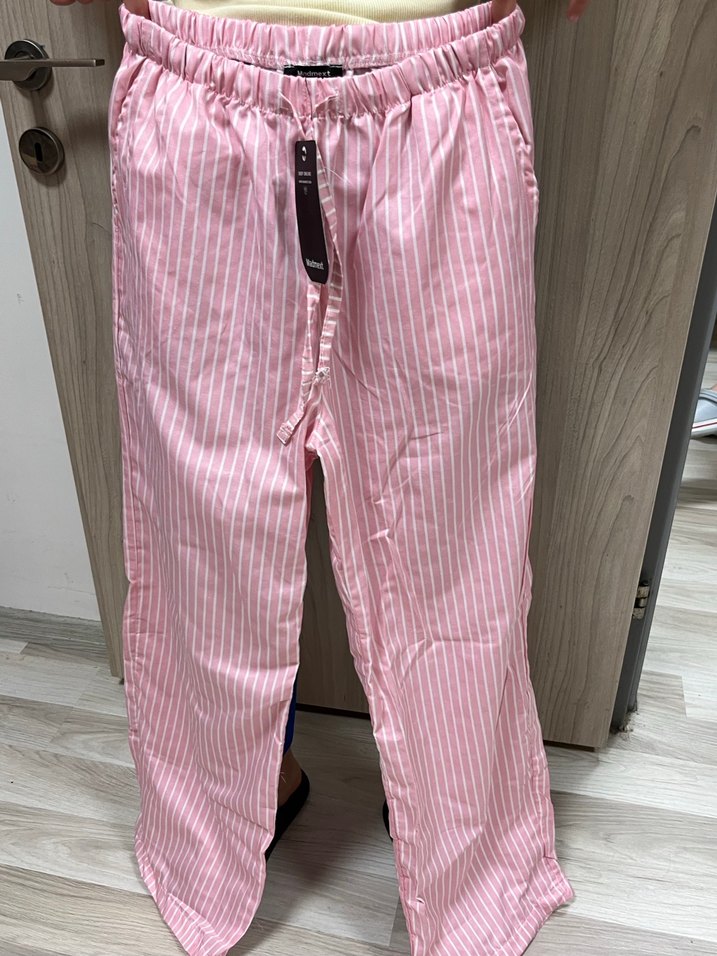 Pembe çizgili, kemerli, orta boy, rahat kesim kadın pantolon. Yumuşak sentetik kumaştan, günlük sokak stili için uygundur.