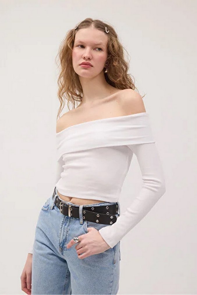 Beyaz denim, kayık yaka ve strappy kollara sahip, günlük kullanıma uygun, rahat şıklık sunan fitted bluz.