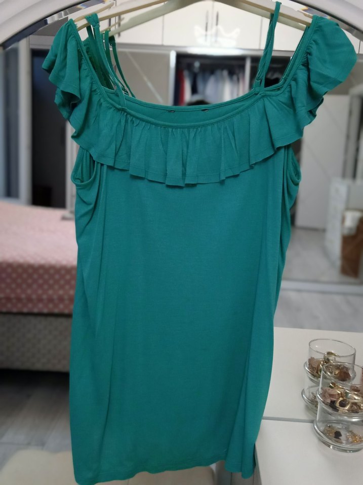 Yeşil renkli, modanna yaka askılı ve volan detaylı kadın bluz. pamuk kumaştan, salaş kesim ve günlük kullanıma uygun bohem tarzda.