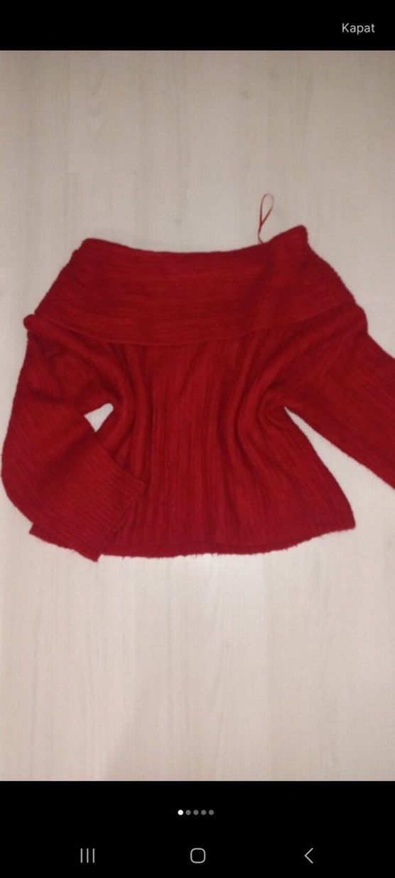 Kırmızı renkli, kayık yaka ve uzun kollu, bol kesim kısa triko kazak. Rahat ve günlük kullanıma uygun bir parça.