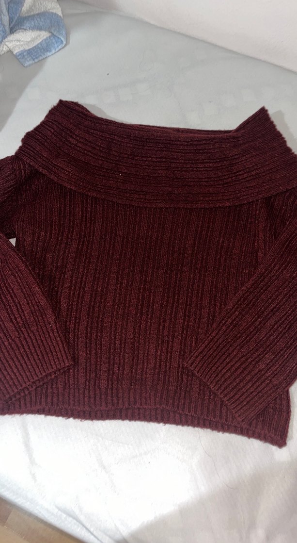 Bordo renkli, örgü triko kumaştan yapılmış, uzun kollu, tek renk, tekne yaka ve normal boyda, rahat kesim kadın bluz. marka gösterimlik standart beden