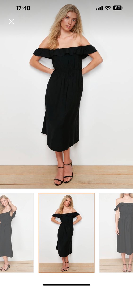 Siyah renkli, dokusu ipeksi uzun elbise, salaş kesim ve askılı kollarla. Kayık yaka detayı ve zahmetsiz şıklık sunar, romantik akşamlar için uygun.
