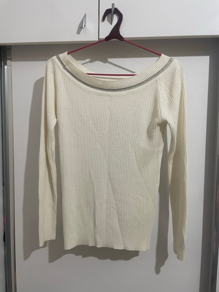 Beyaz pamuklu triko, tekne yaka ve uzun kollu, vücuda oturan kesimiyle günlük ve sokak stiline uygun bir kazaktır. İnce triko
