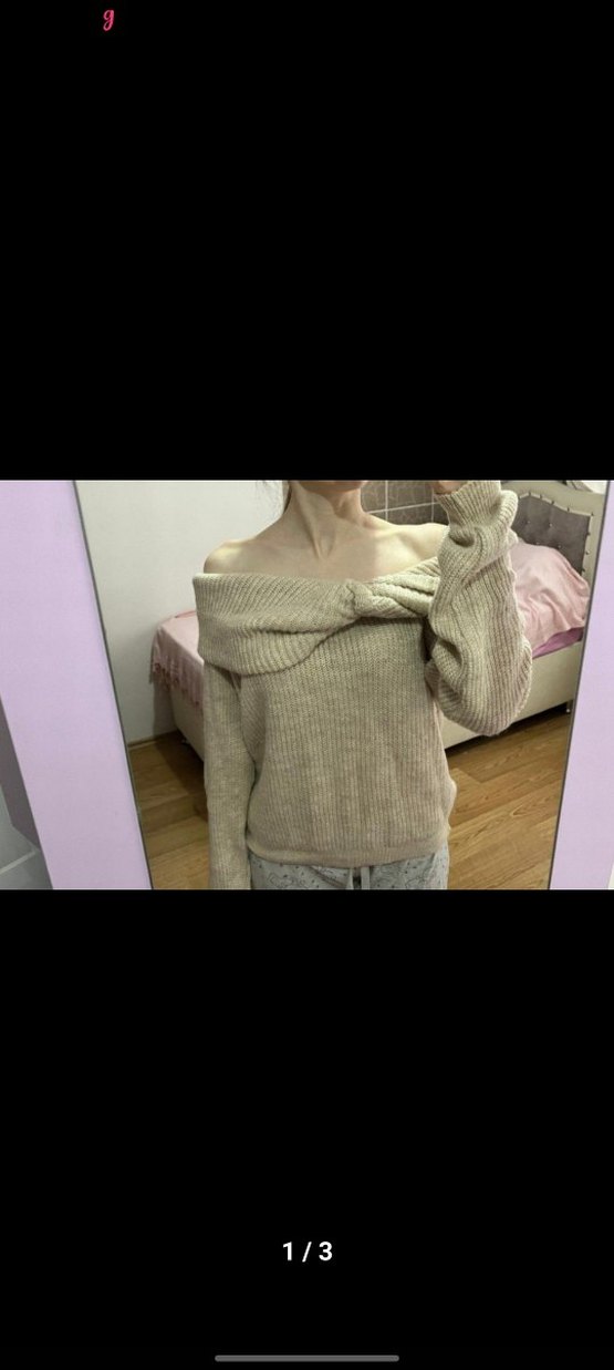 Askılı yaka, uzun kollu, bej renkli örgü triko. Rahat kesim ve midi boyda, günlük sokak stili için uygundur.