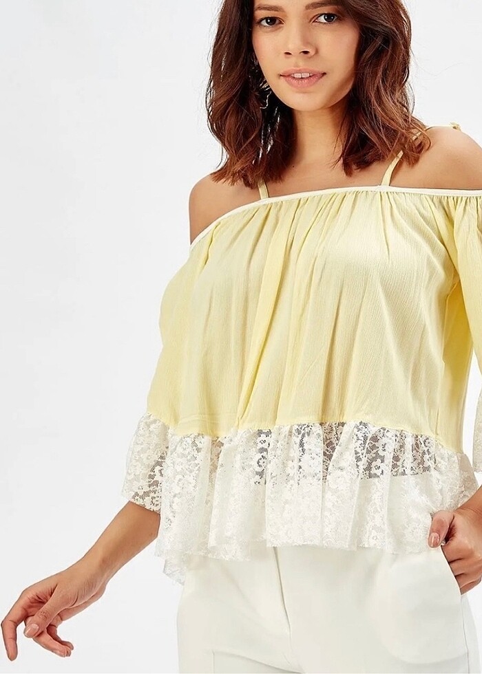 Etek ucu dantelli, yazlık, omzu hem lastik hem askı detaylı madonna yaka. Hediyeydi, hiç giyilmedi. #bluz #sarı #madonnayaka #askılı #dantel