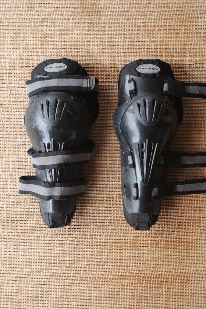 Prosev marka, gri-siyah renklerde kayışlara sahip velkrolu (cırtcırtlı) plastik malzemeden motosiklet dizliği.