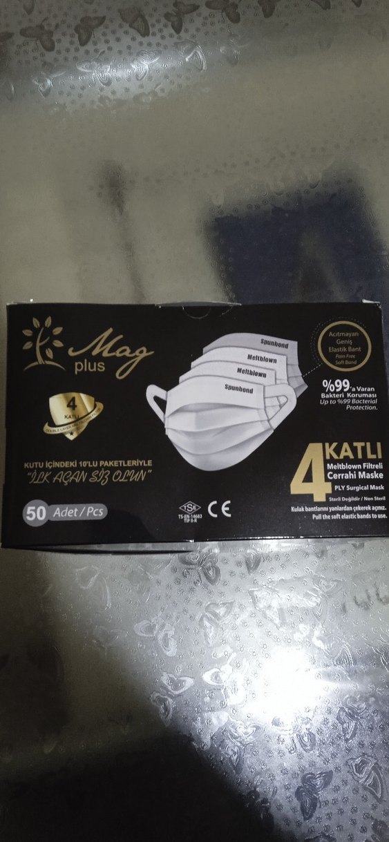 Mag Plus cerrahi maske, 4 katlı meltblown filtreli, %99'a varan bakteriyel koruma sağlar. 50 adet, yumuşak elastik kulak bantlı.