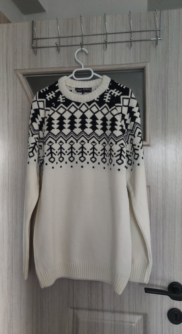 Siyah beyaz örgü kazak, bisiklet yaka ve uzun kollu, bol kesimdir. Bohem tarzıyla rahat ve retro bir görünüm sunar. Günlük kullanım için uygundur.