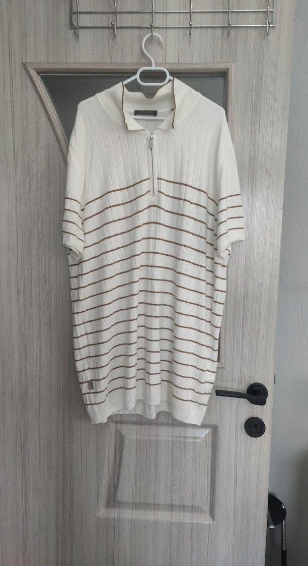 krem pamuklu erkek polo tişört, yakalı ve ön fermuarlı. xl yazıyı ama XXL ve üstünde alabilir Kısa kollu, regular fit ve ince yatay çizgili, rahat sokak stiline uygun.