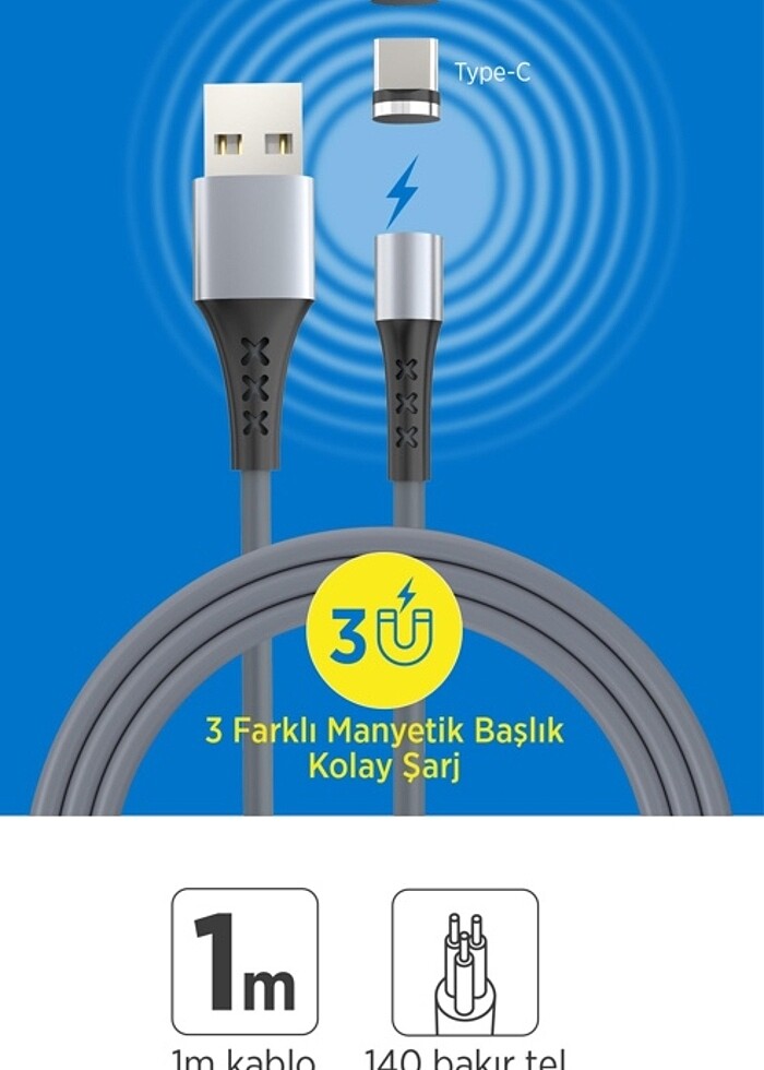 1 metre kablo uzunluğu 140 bakır tel Type-C& Micro USB max. 2.4A Lightning max. 2.1A 3 uçlu Manyetik başları sayesinde kolay şarj Özel plastiği sayesinde kablonuz hiç karışmayacak Özel silikon hissi Ürüne herhangi bir periyodik bakım gerekmez.