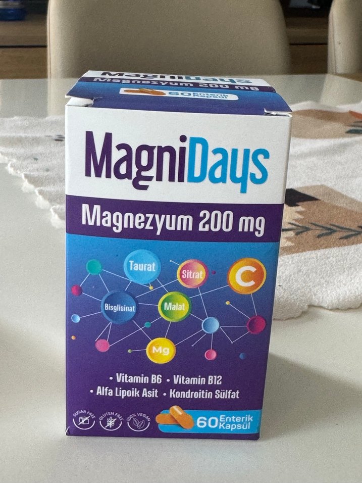 MagniDays, 200 mg magnezyum, Vitamin B6, Vitamin B12, alfa lipoik asit ve kondroitin sulfat içeren 60 enterik kapsülden oluşur.