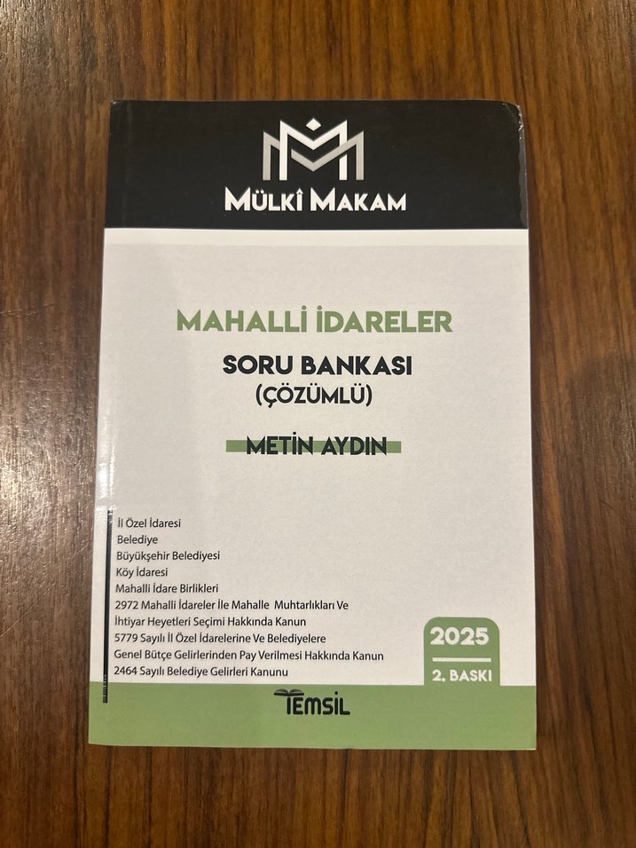 2025 ikinci baskı Mahalli İdareler soru bankası, Metin Aydın tarafından hazırlanmış, yerel yönetimler, seçim heyetleri ve belediye gelirleri kanunlarını çözümlü olarak içerir.