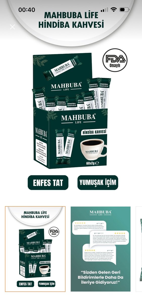 Denemek isteyenler için Mahbuba Life Hindiba Zayıflama Kahvesi, FDA onaylı, yumuşak içimli ve enfes tatlıdır. 60 adet 2 gramlık paketlerde sunulur ☕.