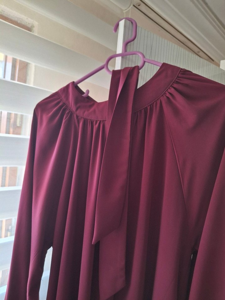 Ande tesettür mürdüm rengi, uzun kollu, yüksek yakalı, drapeli ve bol kesim elbise. Medine ipeği kumaştan, parlak görünümlü. Kısa bir süre önce aldım ama şimdi bol geldiği için satıyorum. 44 bedene kadar uyumlu yazıyor ama 46 bedene de oldu.