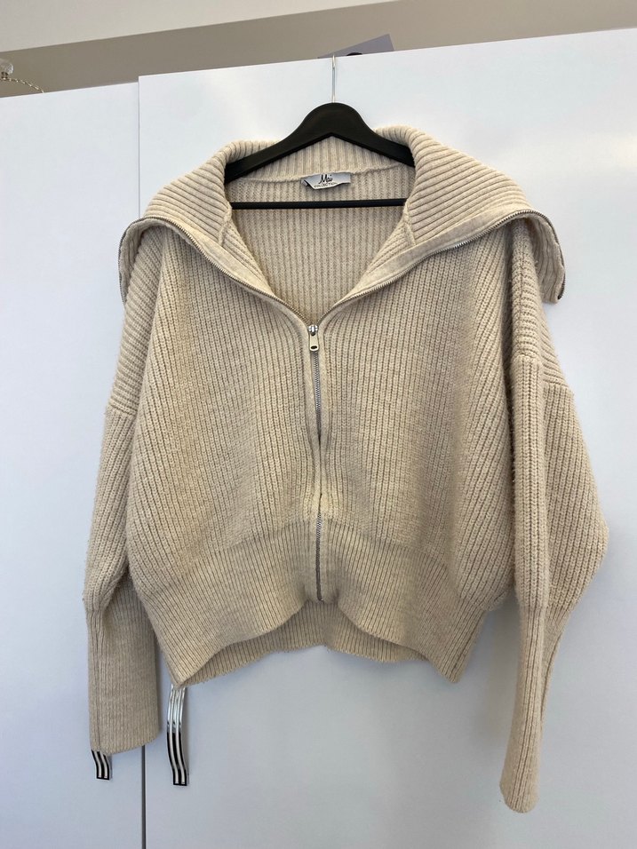 Bej renkli, örgü yün kumaştan, bol kesim, uzun kollu kadın hırka. Yuvarlak yaka ve fermuarlı ön tasarıma sahiptir. Sadece hafif tüylenme var onun dışında herhangi bir sorun yok