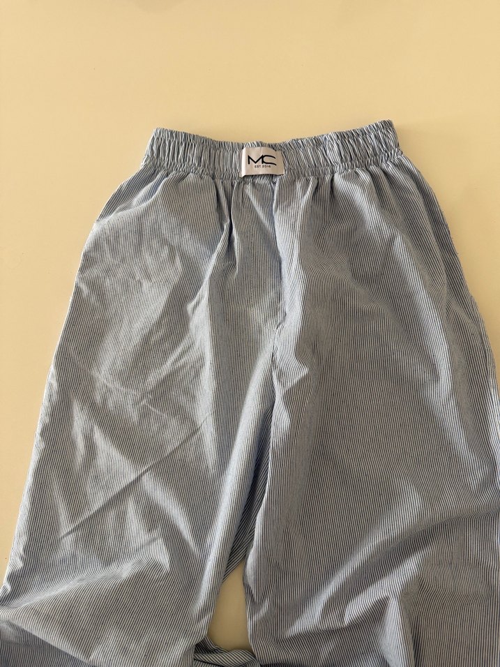 Çizgili elastik bel bantlı rahat pantolon. Günlük kullanıma uygun, zahmetsiz şıklık sunar. Hiç kullanılmadı