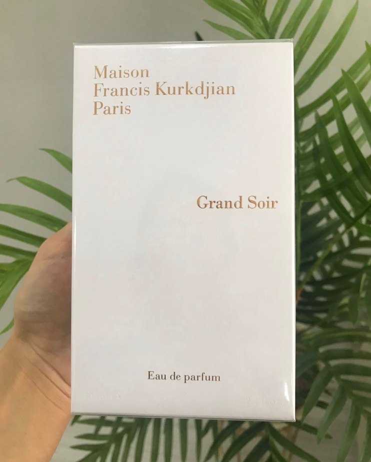 Maison Francis Kurkdjian Grand Soir Eau de Parfum, zarif ve sıcak bir koku deneyimi sunar. Beyaz kutusunda altın yazılar bulunur.