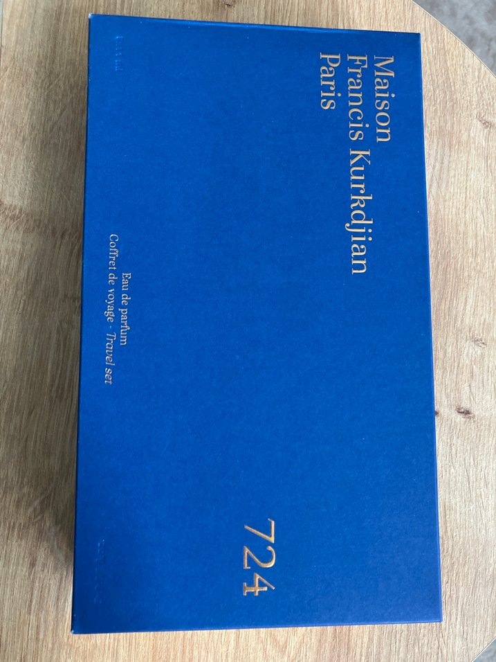 Maison Francis Kurkdjian Paris 724 seti, Eau de Parfum ve seyahat kutusu içerir. Koyu mavi kutu ve altın yazılarla tasarlanmıştır.