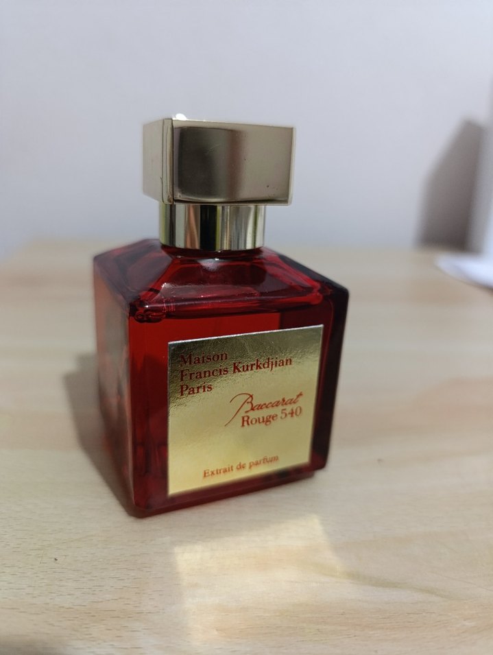 Maison Francis Kurkdjian Rouge 540, yoğun ve kalıcı kokusuyla kadınlara özel, kırmızı şişede altın kapaklı ekstrakt parfüm. kutusu var beyaz renk olan dış kırmızı kutusu yok
