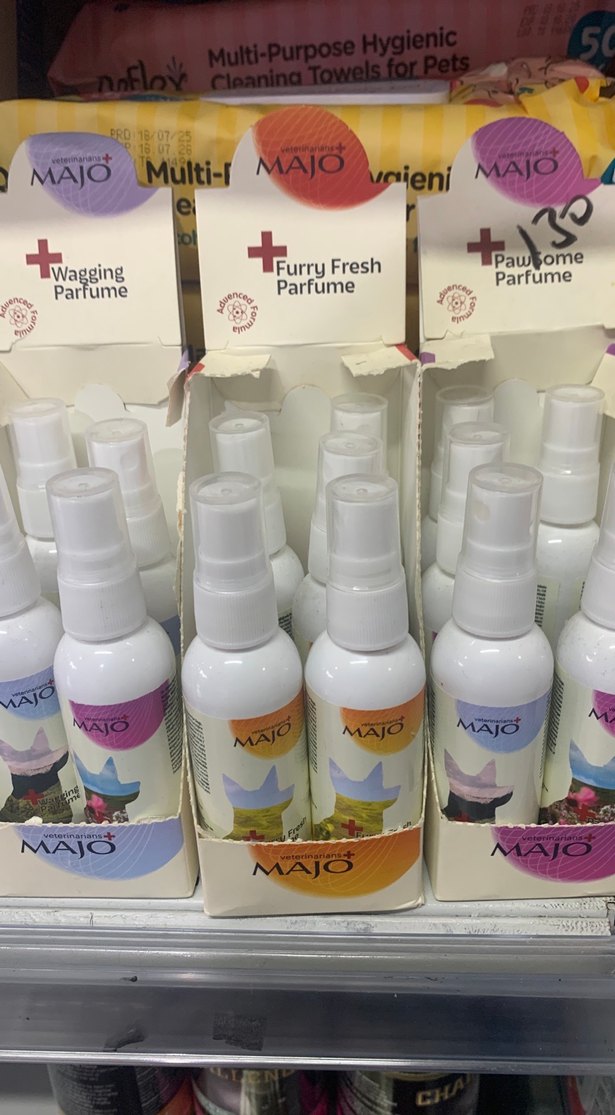 MAJO vücut losyonları, Wagging, Furry Fresh ve Pawsome gibi çeşitli parfüm seçenekleriyle sprey şişede sunulmaktadır.