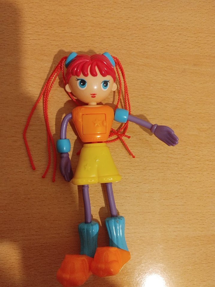 Bu renkli oyuncak bebek, kırmızı ipten saçlara, parlak kıyafetlere ve esnek uzuvlara sahiptir.