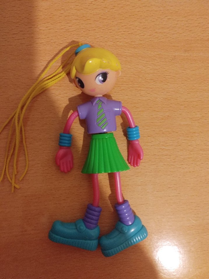 Hareketli kollu ve bacaklı, mor üst ve yeşil etekli, mavi ayakkabılı renkli kız bebek figürü. Sarı ipli saç detayına sahiptir.