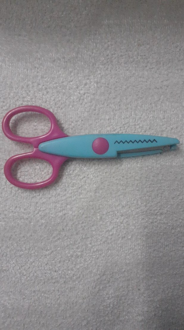 Pembe saplı ve mavi gövdeli, kağıtları dalgalı kenar şeklinde kesen renkli makas. ✂️