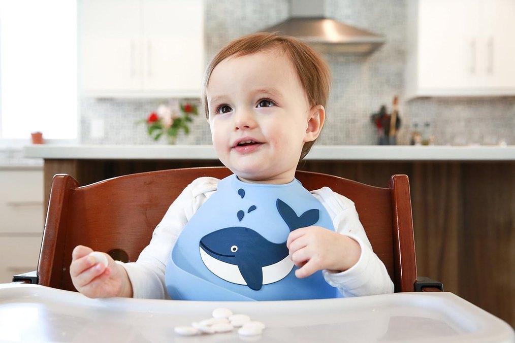 Make My Day silikon bebek önlüğü Pastel mavi renkte, balina baskılı bebek önlüğü, yumuşak ve kolay temizlenebilir malzemeden üretilmiştir.