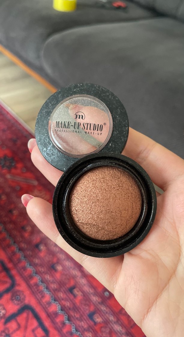 Make-Up Studio markalı parlak bej renkte allık, yanaklara doğal bir ışıltı verir. Kapak üzerinde marka logosu bulunur.