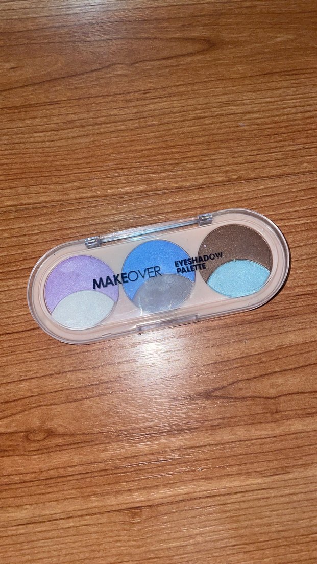Makeover markasına ait, mor, mavi, gri ve turkuaz gibi açık ve canlı renklerden oluşan çok renkli göz farı paleti.