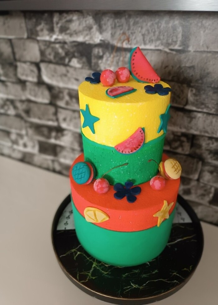 Üzeri şeker hamuru ile kaplanmış iki katlı çocuk doğum günü pastası