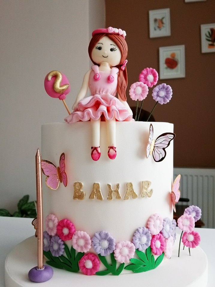 maket pasta isim değişikliği yapılır pastel pembemsi elbiseli bebek figürü, altı çiçeklerle süslü ve 'BAHAR' altın harflerle yazılı pasta süsü.