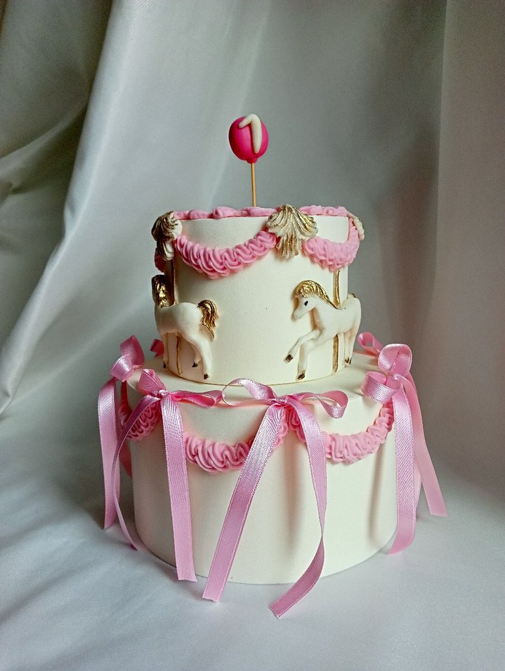 Pembe kurdeleler ve at figürleriyle süslenmiş dekoratif pasta figürü, şık bir süs olarak kullanılabilir . sparis üzerine yeniden hazrliyorum
