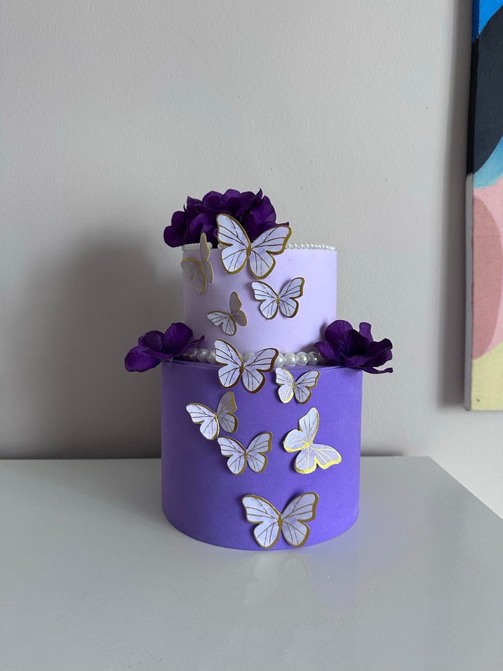 Açık mor renkte, beyaz ve altın kelebek desenleri ile süslenmiş pasta dekoru, mor çiçek detaylarıyla zarif bir görünüm sağlar.