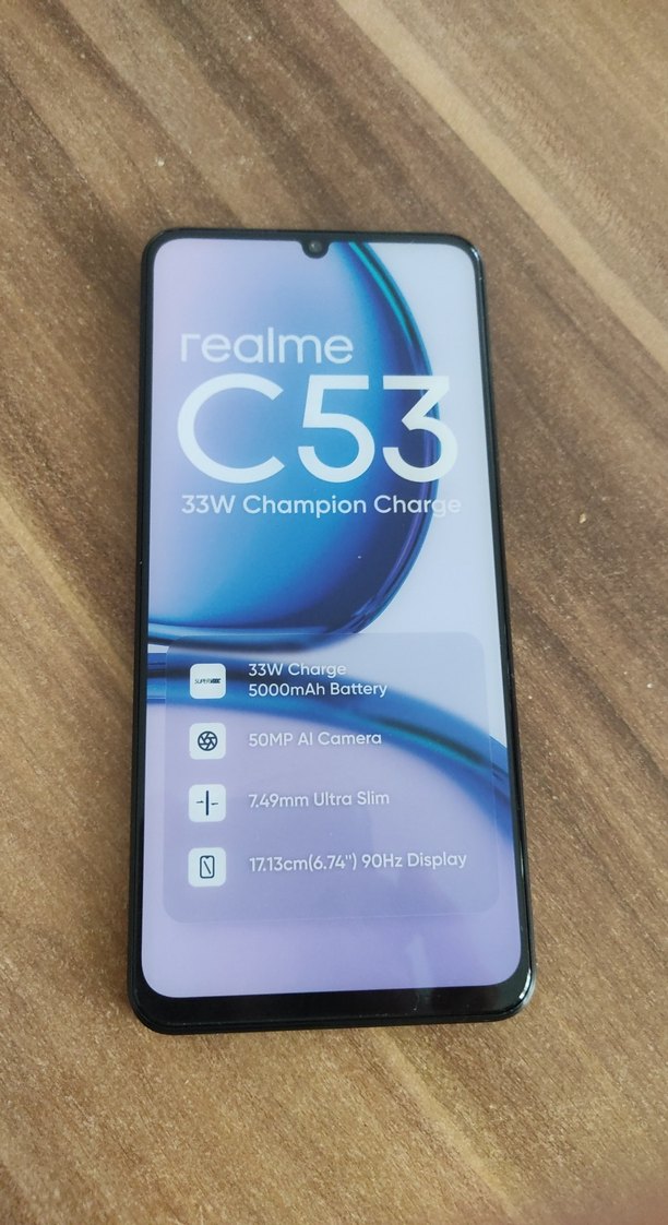 Realme C53, 6.74 inç 90Hz ekran, 50MP AI kamera, 5000mAh batarya ve 33W hızlı şarj ile 7.49mm ince tasarıma sahip. çalışmaz parça yoktur vitrin için özel üretilir bire bir aynı agirlikta