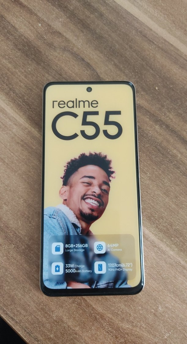 Realme C55 Android telefon, 6.72 inç FHD+ ekran, 8GB RAM, 256GB depolama, 64MP AI kamera ve 5000mAh batarya ile 33W hızlı şarj sunar. parça yoktur özel vitrin için urettimdir bire bir aynı ağırlıktadır gerçek değildir aldanmayin