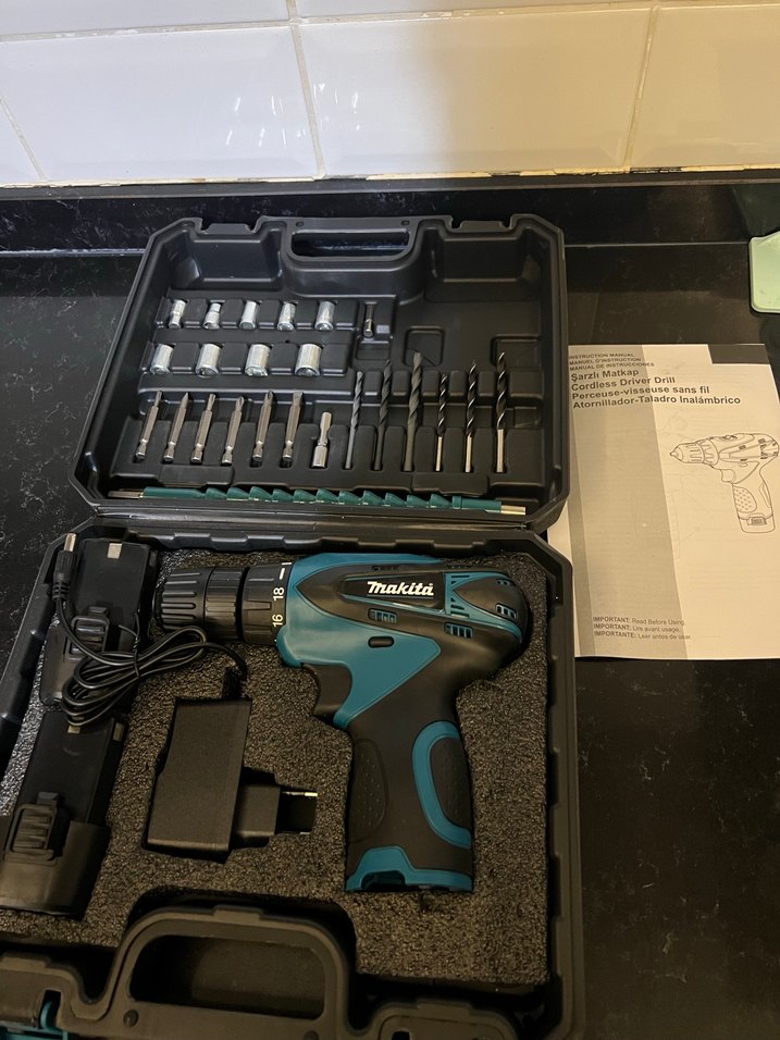 Makita turkuaz kablosuz vidalama seti, çeşitli matkap uçları ve şarj cihazı ile sağlam bir kutuda sunulur.