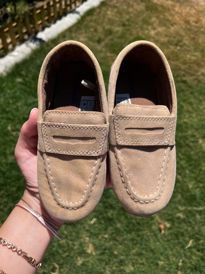 Bej süet erkek çocuk ayakkabısı, sade ve desensiz tasarıma sahip. Günlük kullanım için rahat ve şık bir sokak stili loafer. Dışarı da kullanılmadı . Üzerindeki lekeler yıkanınca çıkacaktır . Sorunsuzdur