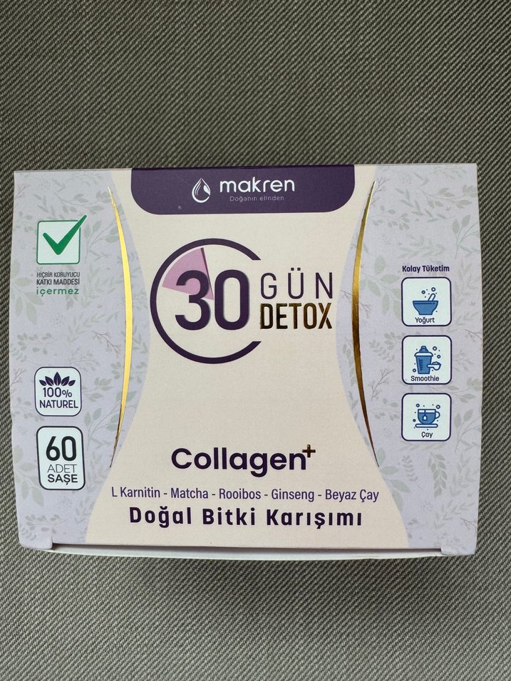 Makren 30 gün detox collagen+ doğal L-karnitin, matcha, rooibos, ginseng ve beyaz çay karışımıdır. 60 adet şase içerir, yoğurt, smoothie ve çayda kolayca tüketilir. İyice bakarak alın iade yoktur