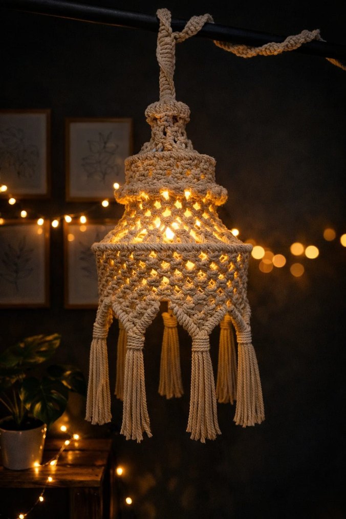 Tamamen el emeği, şık ve modern makrome avize. Evinize bohem bir hava katar. Boyut: 40 cm yükseklik. Halka: 19 cm çap. Kablo: 1,5 metre (duy/fiting dahil). Durum: Yeni ve hazır ürün.