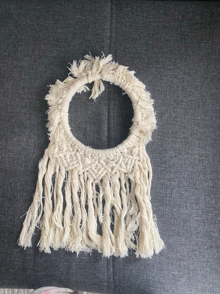 Bej renkte nakışlı detaylara ve püskül tasarıma sahip dekorluk . Yumuşak ve dekoratif, gri zemin üzerinde.