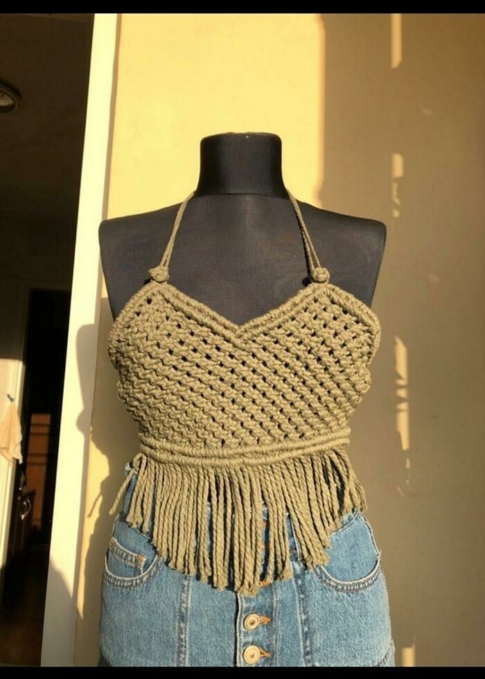 Makrome burgulu ip ve makrome teknigi ile örülmüştur S beden uyumludur