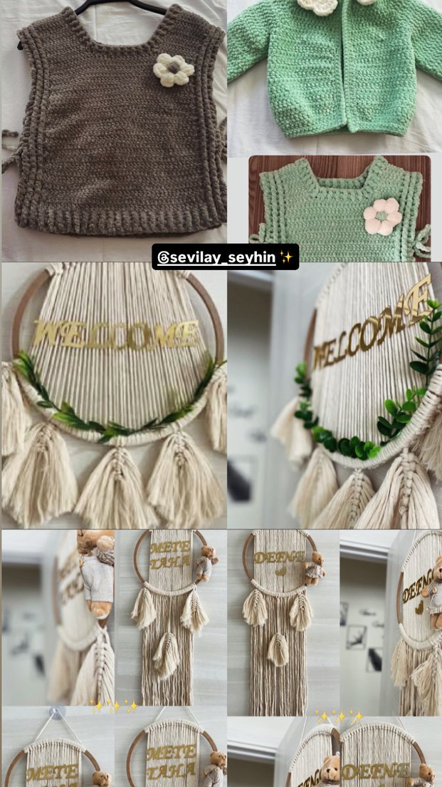Açık haki renkte makrome duvar süsü, "WELCOME" yazısı ve püsküller ile doğal bir dekorasyon sunar.