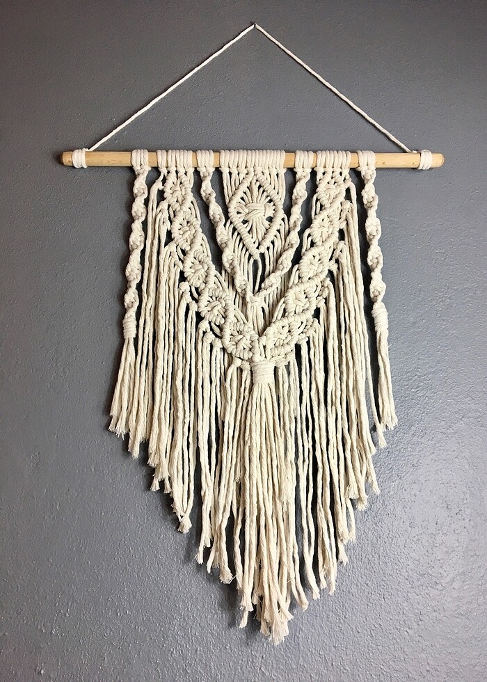 El yapımı makrome duvar süsü Yükseklik : 80 cm Genişlik: 50 cm Renk : Krem Farklı renk isterseniz mesaj gönderebilirsiniz. Not : El yapımı olduğu İçin ölçülerde küçük farklılıklar olabilir , kullanılan dübel değişiklik gösterebilir . #handmademacrame #elyapımımakrome #makrome #makromeduvarsüsü #evdekorasyon #dekorasyon #zara #mango #civil #panço #bershka #rusticstyle #bohem #boho #bohomacrame
