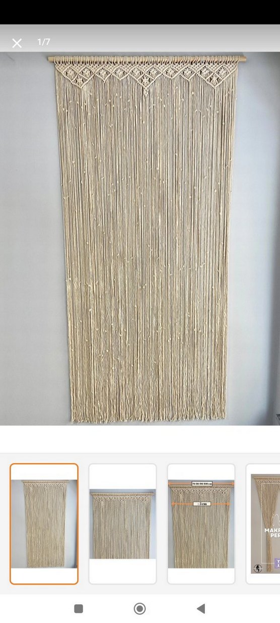 Uzun ince iplerden oluşan, desensiz ve doğal görünümlü bej bohem tarzı perde. Odaya yumuşak bir doku katar.
