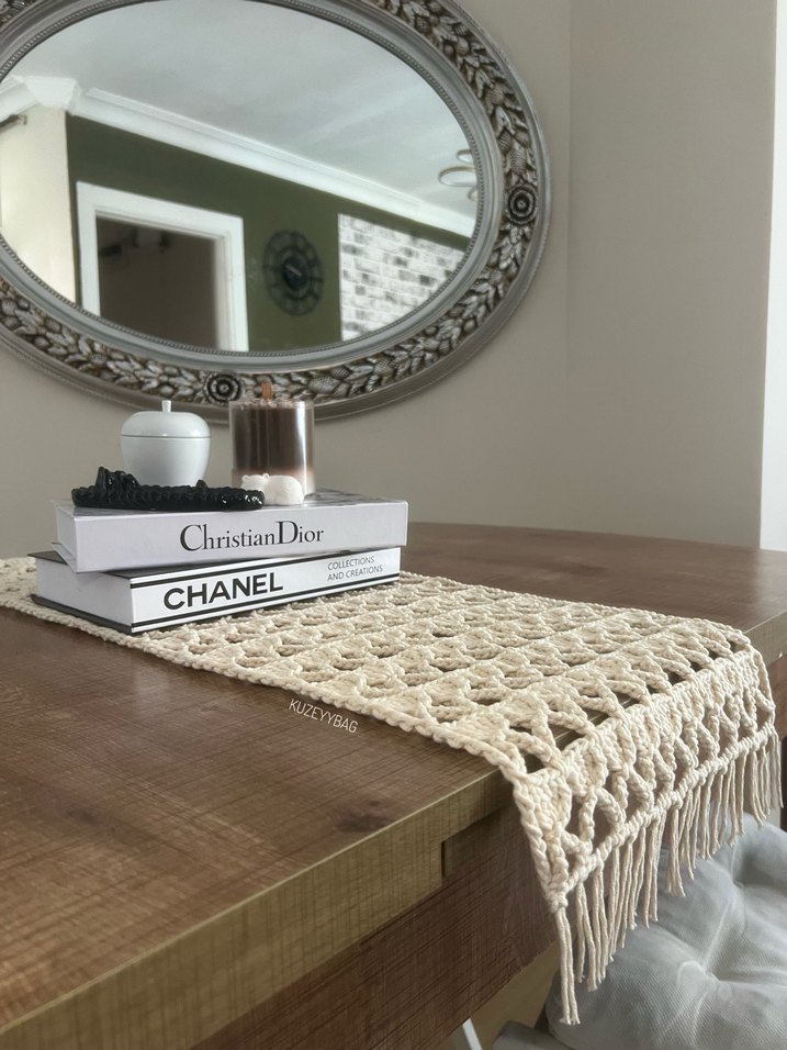 püsküllü kenarlarıyla dokuma desenli makrome masa örtüsü. Christian Dior ve Chanel kitapları altında şık bir dekor yaratır. Lütfen ilan açtırın!